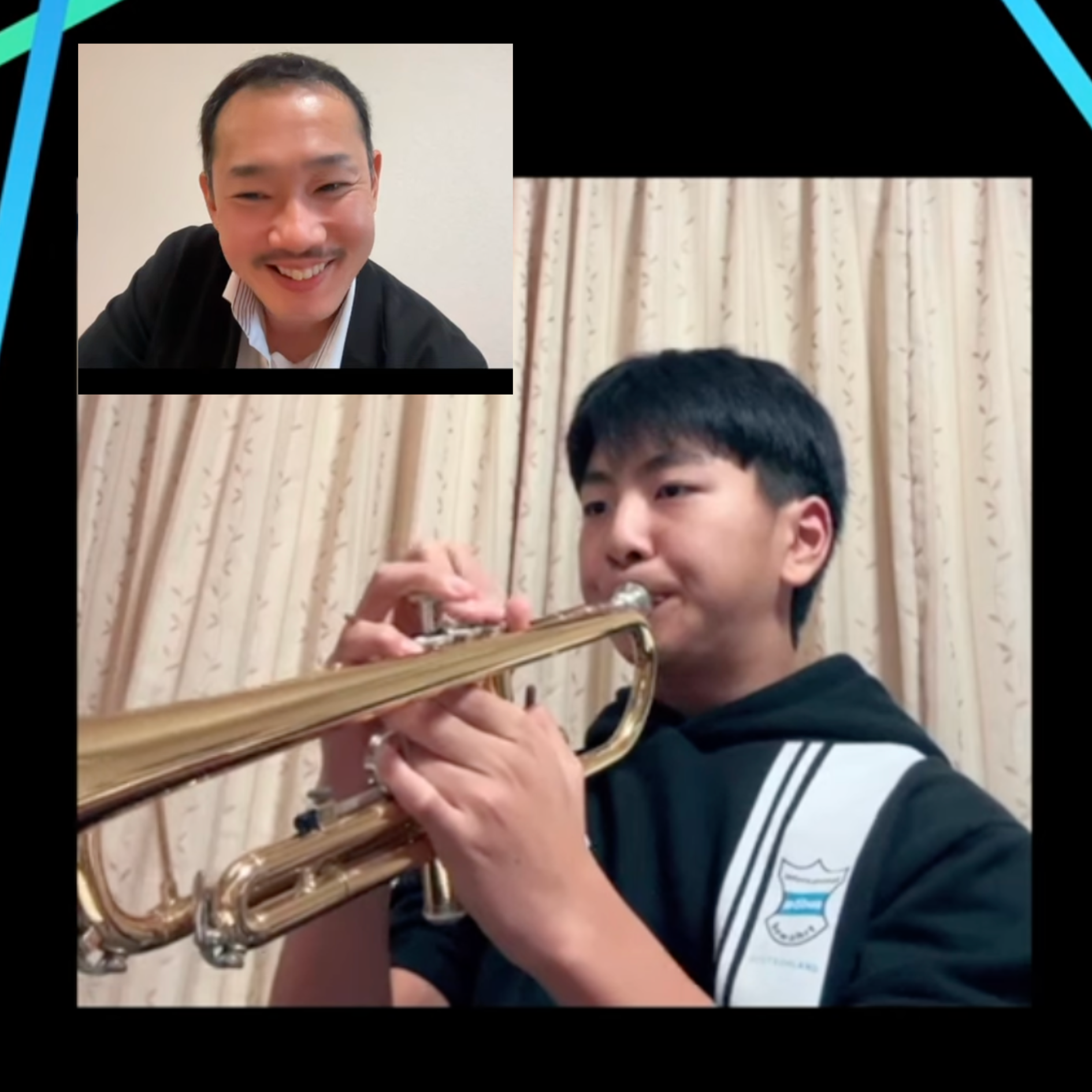 こちらはトロンボーンの女子中学生とのレッスン風景です。これが日本全国どこにいてもできる!ほんとに便利な時代です。オンラインの音質とタイムラグが気になる方もいらっしゃると思います。こちらは2025年2月頃のレッスンです。受講される方は自宅、顧問の先生の許可を得た音楽室、カラオケボックス、集会所などなど様々です。受講料は1時間7,000円(学生)/ 8,000円(一般)でお受けしています。内容は金管の基礎やアンブシュアの相談から、木管弦楽器ピアノなど幅広い楽器ジャンルの音楽表現法、さらには音楽理論や合奏指導法、吹奏楽部で悩みや留学の相談などなど。私が助けになりそうなことであれば、どんなことでも広くお話ししていただいています。皆さんの受講風景がネット上に公開されることはありませんのでご安心ください。