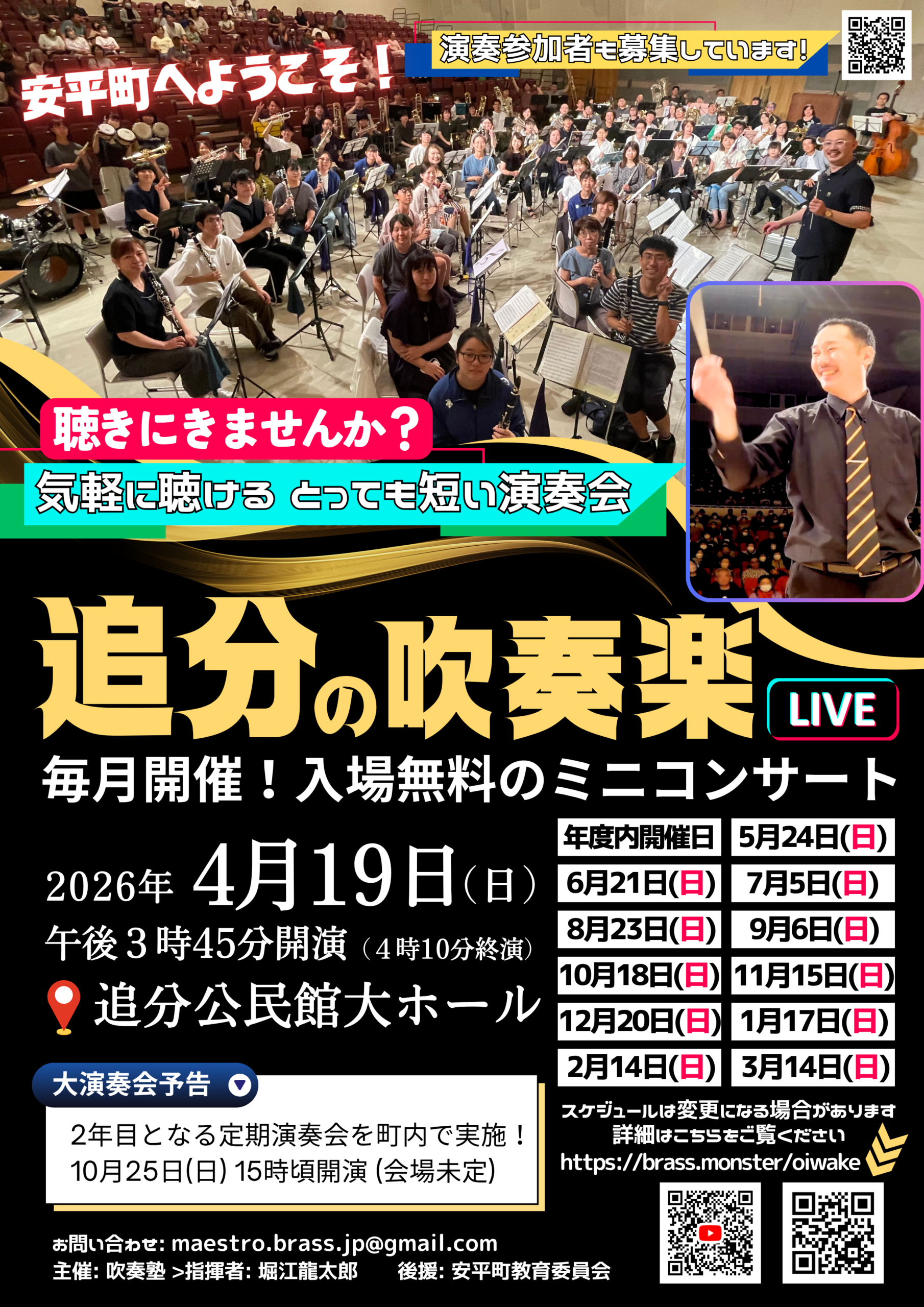 4月19日(日) / 5月24日(日) / 6月21日(日) / 7月5日(日) / 8月23日(日) / 9月6日(日) / 10月18日(日) / 10月25日(日) 演奏会/ 11月15日(日) / 12月20日(日) / 2027年1月17日(日) / 2月14日(日) / 3月14日(日)